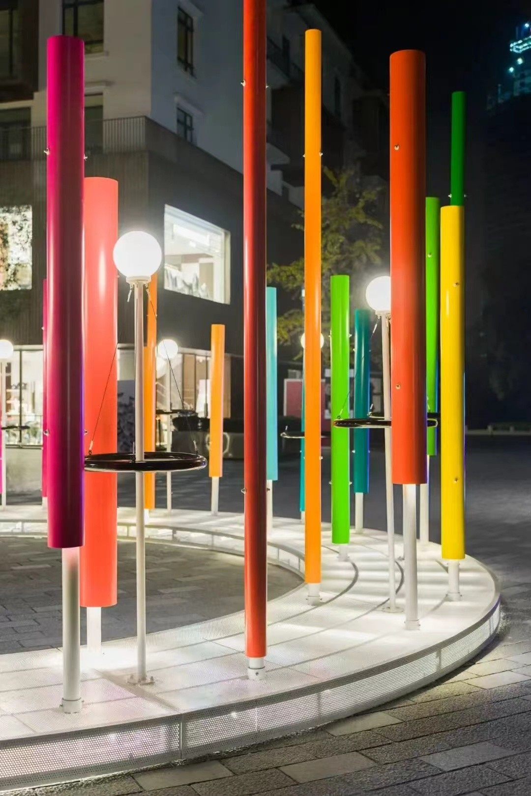 在收到“回环之歌”的命题后,建筑师沈若凡决定以“回环之歌”的“歌”作为切入点,因为比起相对具象的造型装置,他认为无形的声音更具共通性,能唤起公众的感知和共鸣。他想起了巴黎街心公园里的马林巴琴,无论年女老少都会上前敲打嬉戏,温暖圆润的声音在小森林里回荡。“我个人不懂音乐,从我初步的认知来说,这件作品应该和打击乐有关,通过敲击来传递声音的感受。所以我找了懂音乐的朋友刘恒,过程里他又找了他的朋友杨帆,变成了一个团队创作。”