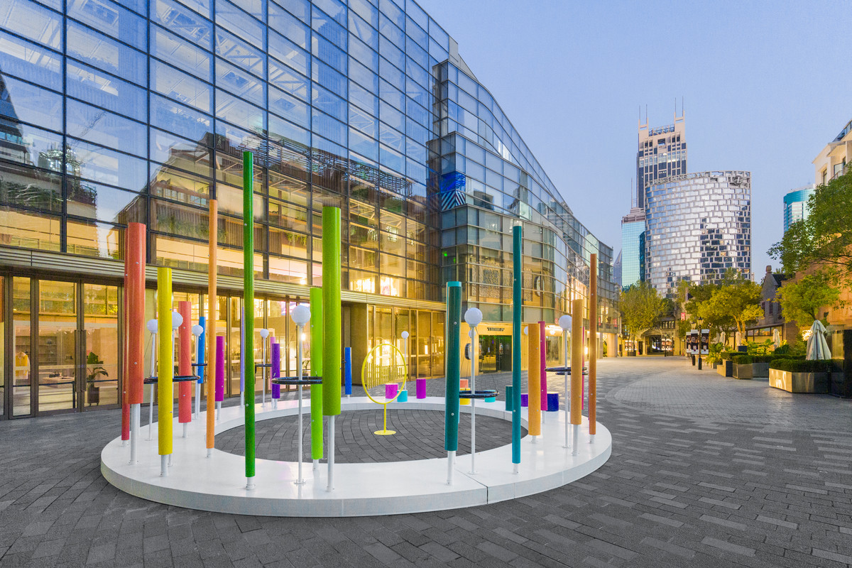 《1-4-5-1》是建筑师沈若凡、音乐家刘恒与杨帆联合为2022年上海新天地特别创作的一组声音装置。作品由12组空心圆柱体阵列组成,造型与发声原理源于中国传统编钟,每组阵列中间的圆球与柱体碰撞击打,即发出三组正三和弦的和谐音律。