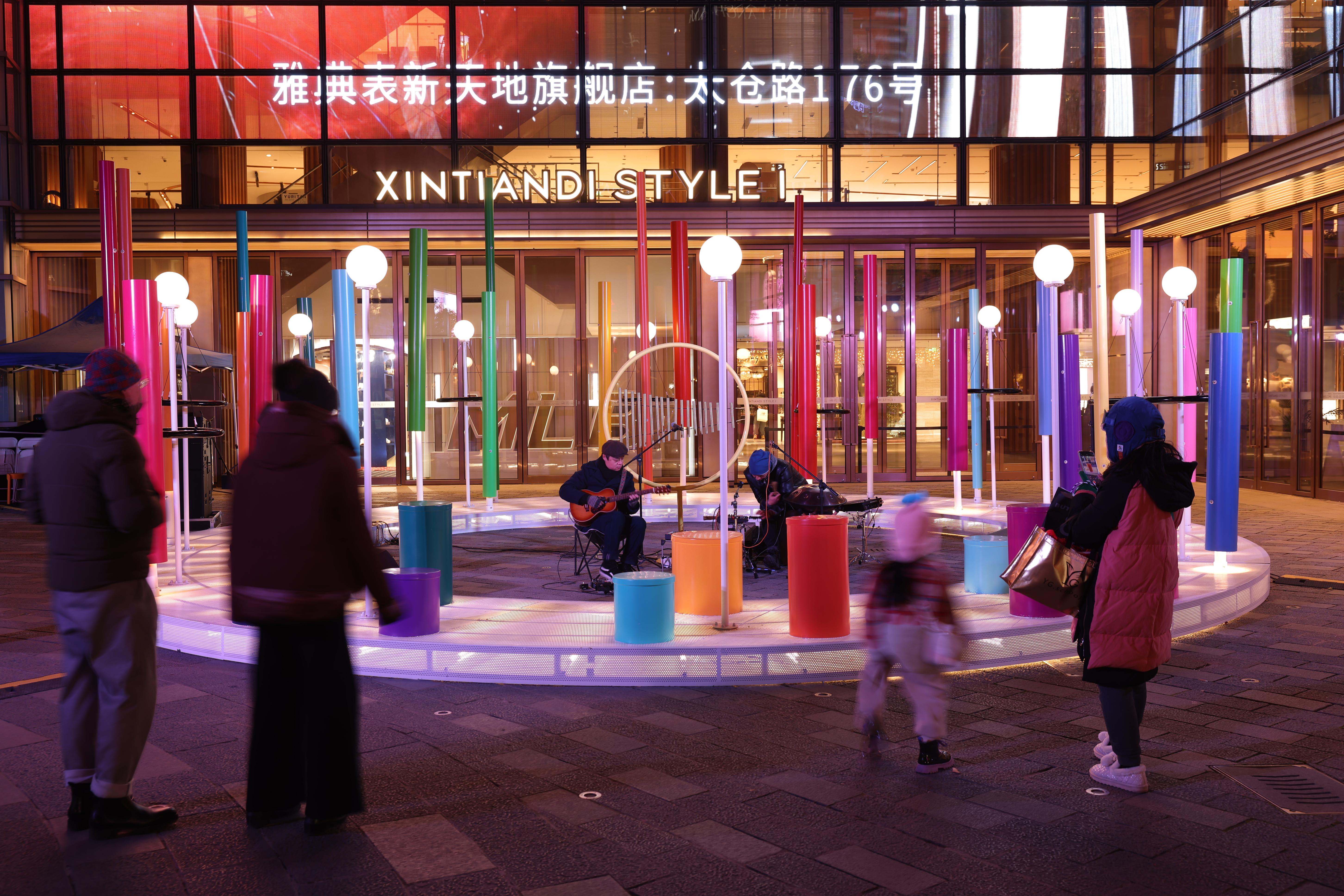 这组声音装置的和谐性会让人产生很强的共鸣感,和声的进行也令人感到舒适与释放。在新天地“燃冉”艺术季的场域中,每个人都可以参与其中,编织属于自己的音乐片段,由此而生成的“回环之歌”是送给上海的新年礼物,也因此成为每个人为自己谱写的新年之歌。