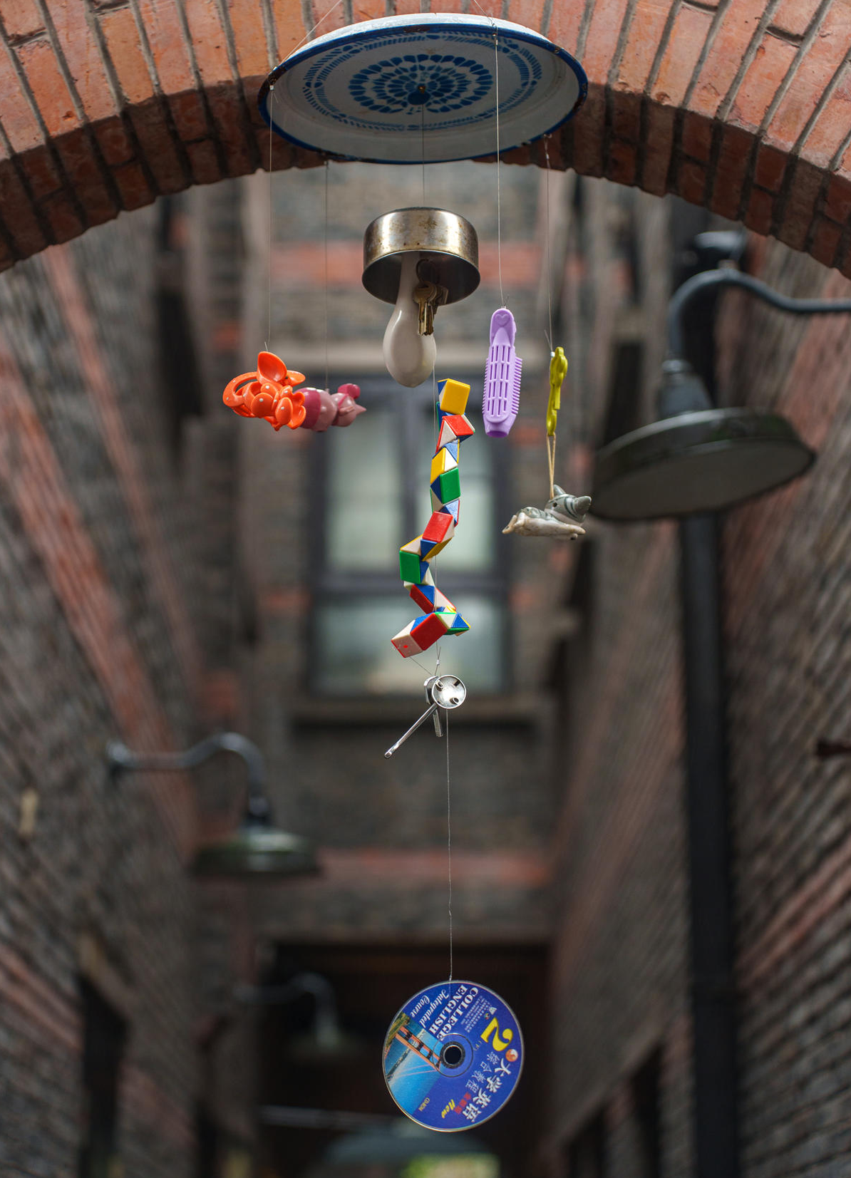 经过对工作和生活于新天地区域人们的探访、沟通与交流,并在新天地周边收集生活废弃用品,艺术家葛宇路制作了风铃,挂在新天地后巷区域。
