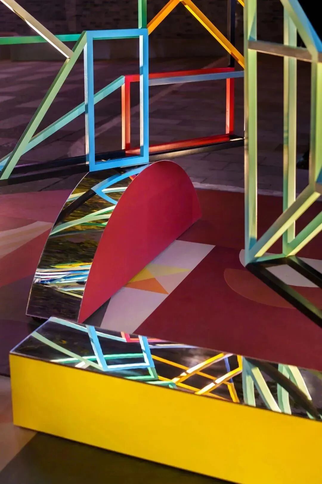 《旋转门》以抽象画面先决而直观地调动公众的情绪。“色彩是情绪的钥匙,但色彩需要在结构里找到合适的位置才能最大限度发挥其作用。”作品中,这色彩是流动而温暖的。天顶画部分结合了顶光玻璃过道的透光属性,复古的冷暖色对比营造了大面积的温暖氛围;地面上的旋转门装置采用了具有童趣的怀旧色彩,可进行不同角度的转动,镜面部分映照街景,形成呼应。