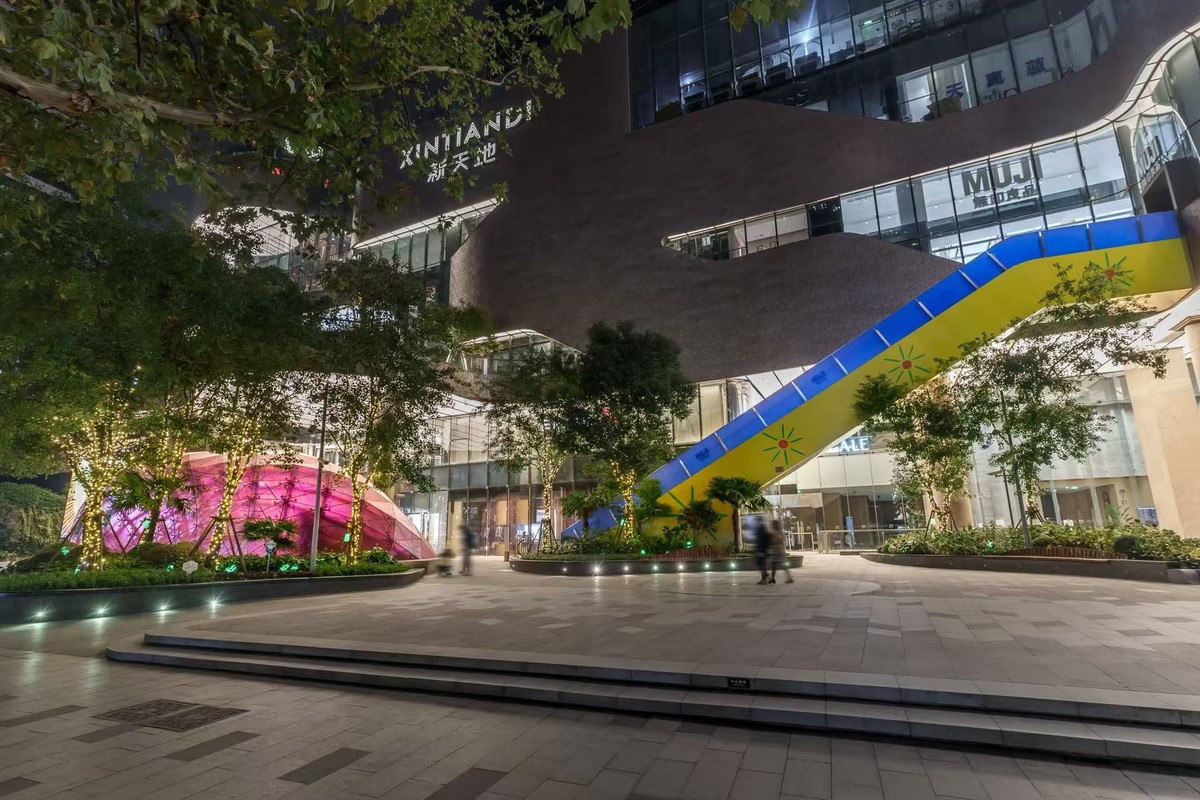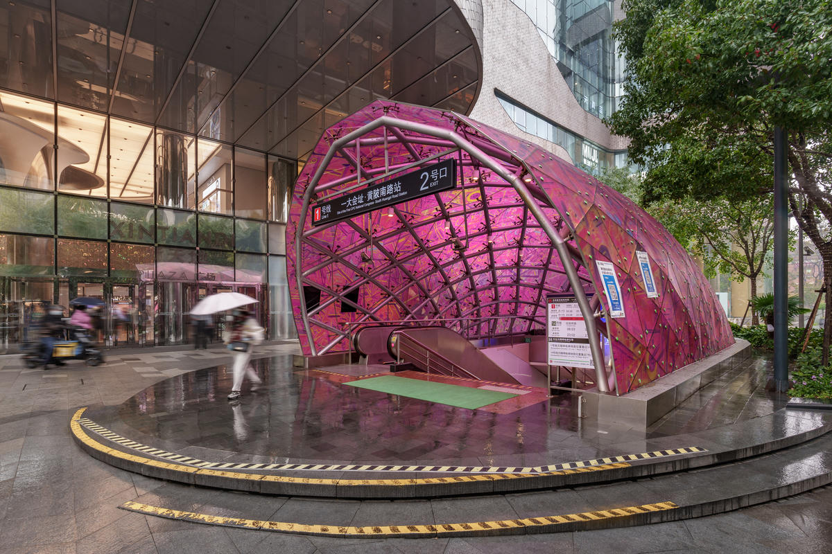艺术家麻剑锋将毗邻新天地的黄陂南路地铁站2号出口的顶棚与其附近的电动扶梯作他绘画创作的基底,以其标志性的艺术语言将本无联系的两个建筑体串联,打破空间的固有印象,将新天地局部抽离现实语境,创造了一个超现实、充满想象力的时空。
