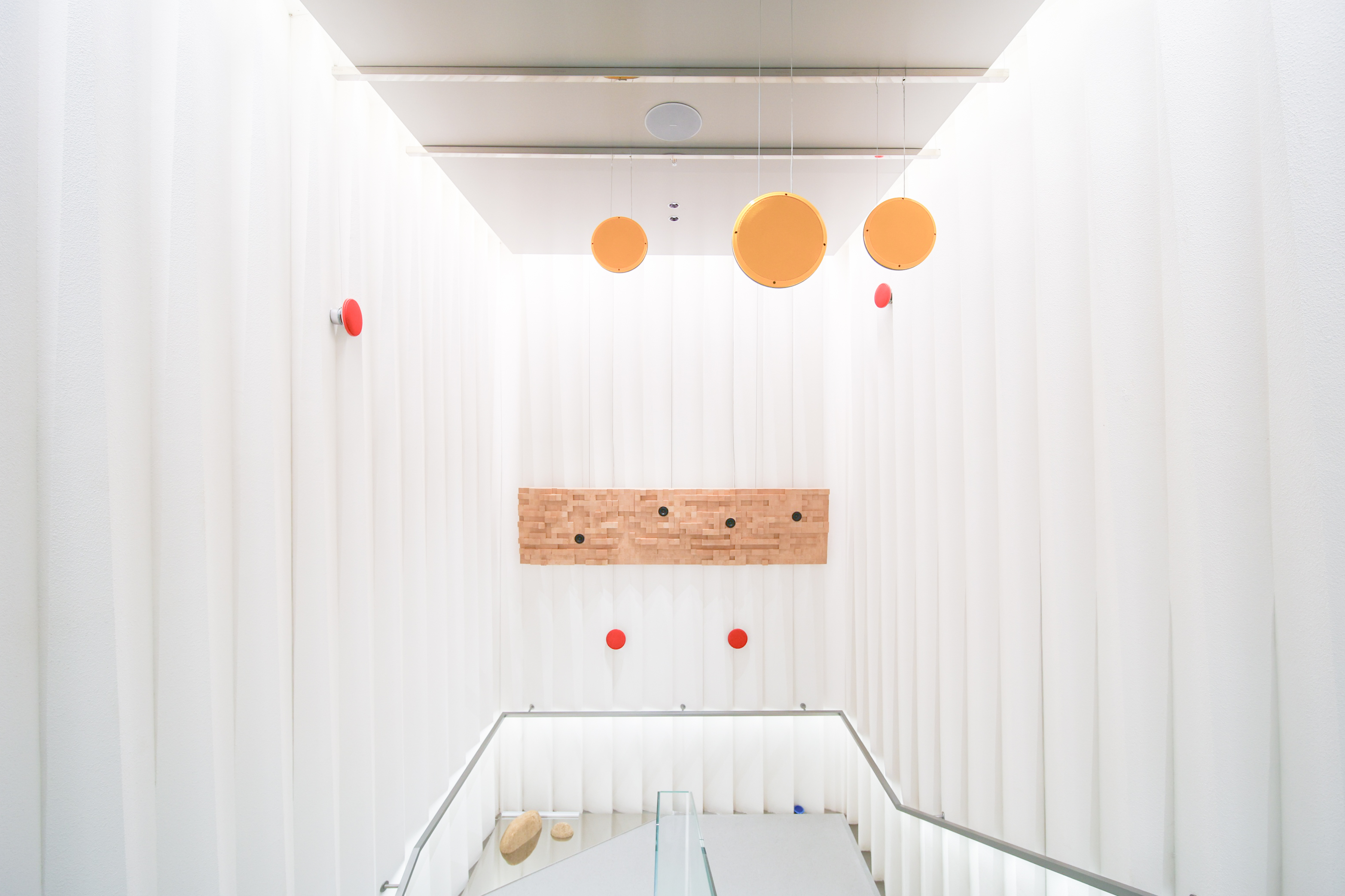 《野响》是一件听觉空间作品。艺术家在楼梯这一日常功能空间中安置声音与物件,以此营造一个自然与人迹相交织的听觉环境。在这个递进式、充满象征意义的听觉环境”中,艺术家希望通过引导观众的聆听与移动,唤起观众的听觉感知与身体意识。作品中的互动元素亦在以隐喻的方式提出问题:在自然中,人的可听之声与可为之事为何?